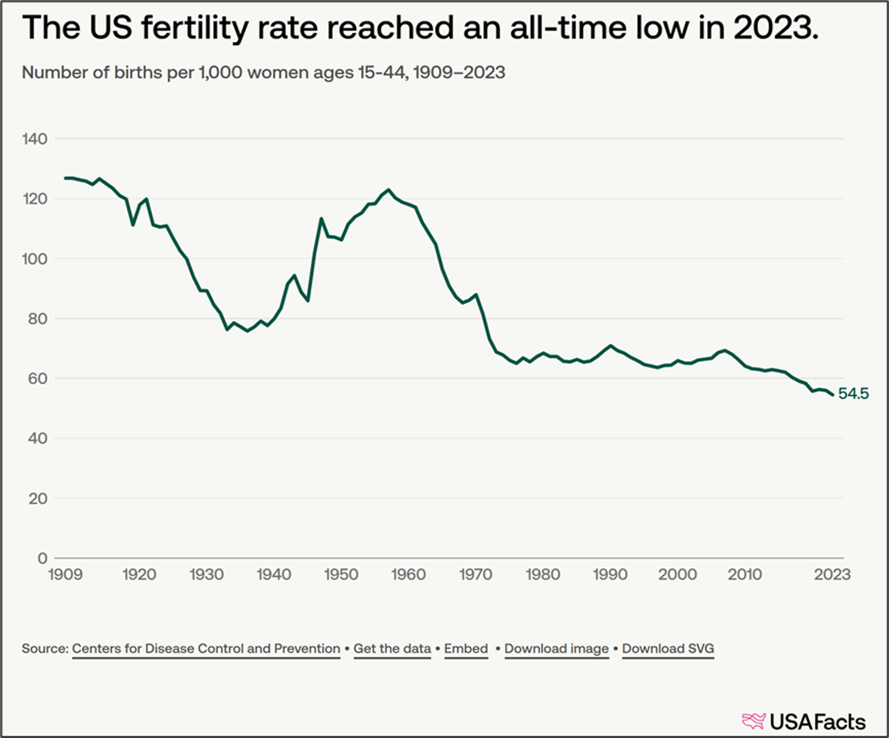- Demand is Structurally Declining. Declining births implies declining family formation, therefore reducing the aggregate need/desire for young people to buy houses. Declining birth rates are also a function of the aging of the U.S. population. As the median age increases, there are fewer people of the age who would have a child as a % of the population. Finally, the fertility rate among women aged 15-44 has dropped significantly in the last 20 years. Whether this is simply a societal shift or a reaction to the high cost of child care, the result is the same – a declining birth rate. Fewer children will invariably lead to lower homebuyer demand. In addition, demand for 4/5 bedroom houses should also decline if family size declines.