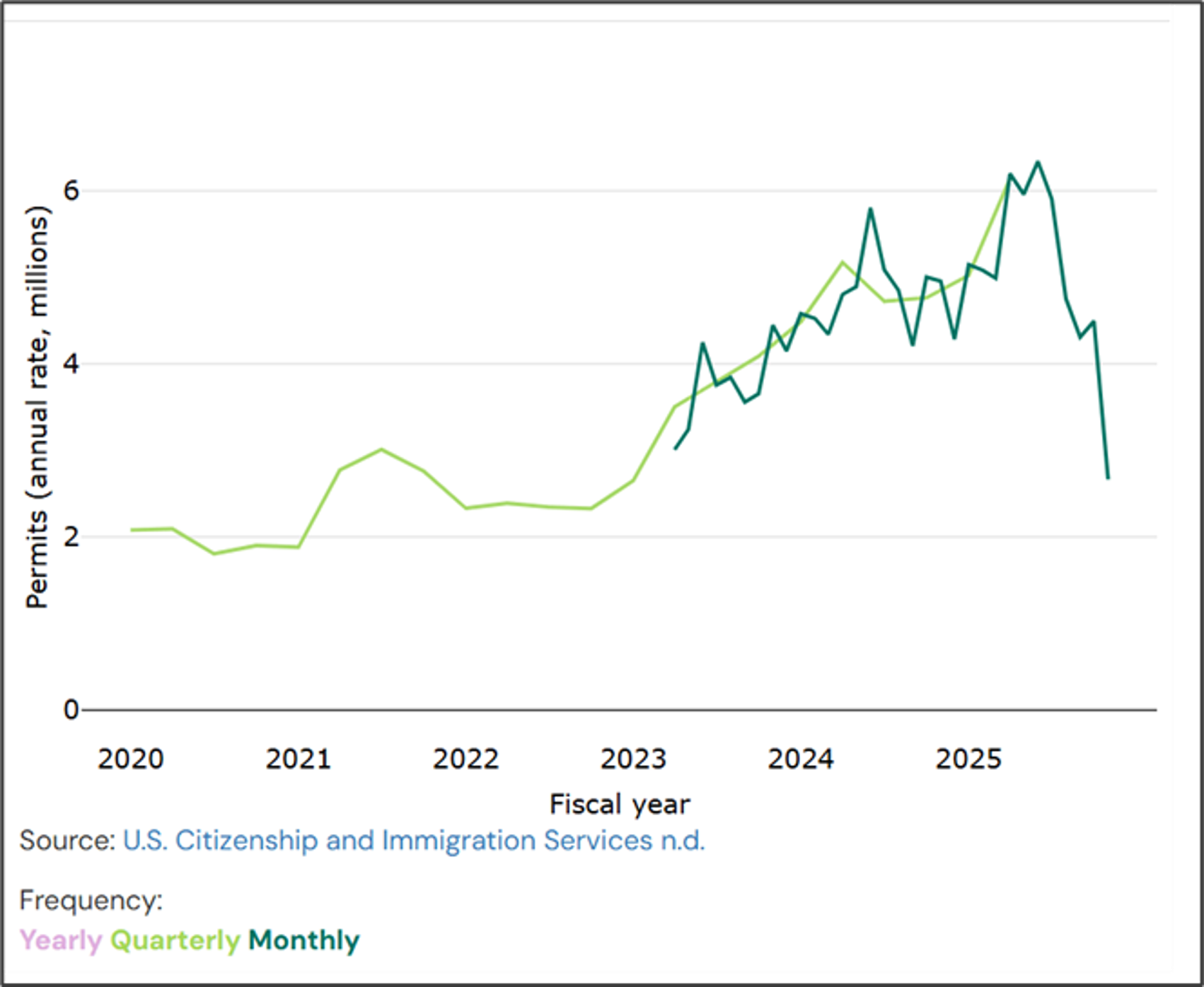 - Weakening Rental Demand: Rental affordability is less of an issue, but rents are facing several headwinds, including lower population growth/immigration growth and recently some hiring weakness. Work permit applications (shown below) have plummeted, which does not bode well for rental demand and rent growth is the slowest it’s been in 14 years, according to Gerli.