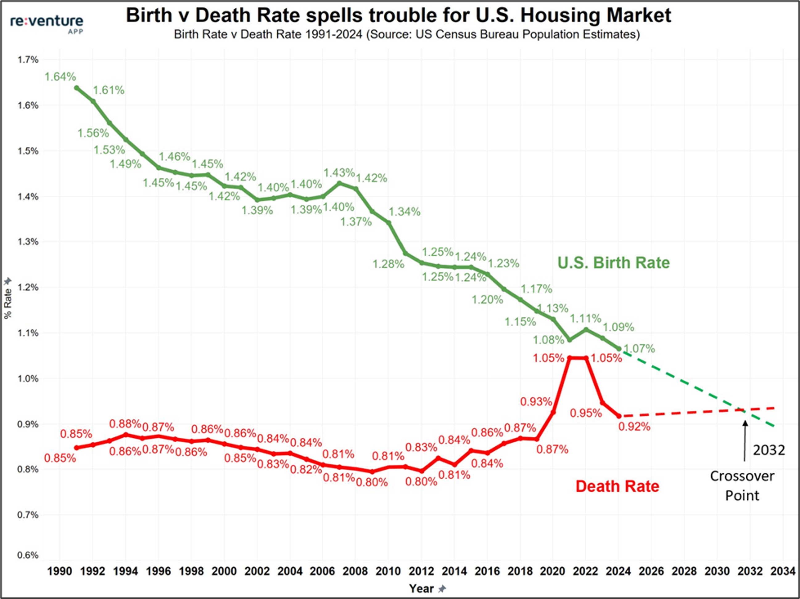 The demographics will dictate the long term, but the housing market remains in an almost locked state as those with low-rate mortgages are largely unwilling to give up that advantage. However, Gerli believes that we are entering a ‘disinflationary/deflationary vortex’ and that the US is on the precipice of a big decline in home prices that can continue into 2026.