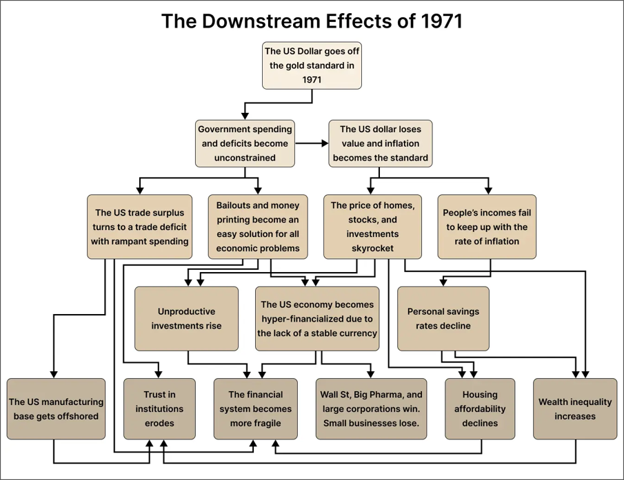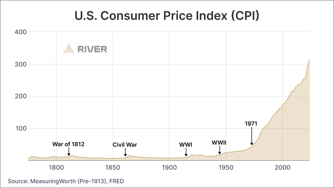 I recently went back and listened to a 1979 interview by Phil Donohue with Milton Friedman, a Nobel winning economist. What was striking was that discussion focused on many of the same economic issues we face today – affordability, wealth disparity, government spending and regulation, healthcare costs, free markets, and free trade. You’d think that 46 years later, we’d have figured out at least some of these problems! But that is not the case, and the root cause goes back to President Nixon’s decision to go off the gold standard. I found the following chart on River.com, a firm that, not surprisingly, describes itself as a ‘Bitcoin-only financial institution’. The evidence suggests that the problems created in1971 largely remain and many have become worse.